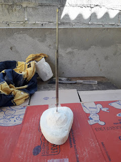 Iniciei preparando a estrutura para sustentar a imagem, preparei o cimento branco e com as mãos modelei um suporte com um ferro central mostrado na imagem abaixo:
